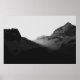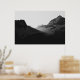 Black and white photograph of sun rays shinning over the mountains in Trenta valley, Slovenia.