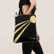 Elegant tote bag with sun rays on black background. Three rays emerging from the sun are three aspects of life: body, mind and spirit. The sunny text can be personalised.