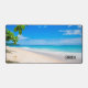Desk mat with a lovely photograph. A white sandy beach with azure blue water. Relaxing image with a sunny sky and gentle foamy surf with some cute tropical leaves framing the image.