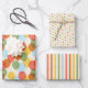 Celebrate a birthday with this cheerful and fun birthday gift wrap featuring a coordinating set of three patterns. The first sheet features a charming pattern of translucent birthday balloons, the second coordinated polka dots and the third a simple stripe pattern. All three use the same colours from of sun-washed mint green, mustard yellow, warm coral, rusty pumpkin orange and powdery sky blue to tie your whole pile of gifts together for a professional look and seamlessly coordinated wrapped gift set.