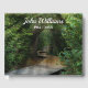 Sunbeams in woods with a wooden walkway for a funeral guestbook.