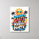 Front and centre is the funky, feel-good quote, wrapped in sunny beach elements: a cool cartoon sun rocking shades, swaying palm trees, vintage surfboard, rolling ocean waves, and cheerful tropical accents like starfish and hibiscus blooms. It’s a whole summer mood — radiating happiness, heat, and high tides.