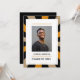 This graduation card announcement features a sunburst background in black, gold and orange colours with a room for a vertical photo framed by a white frame.Personalise the card adding your photo, name and year.