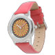 A very bright and colourful design. A stylised sun with a spiral centre and in flaming colours fills the entire watch face. No numbers are on the face. Due to the design of the hands, the Stainless Steel version might be a bit more difficult to read than the other styles.