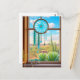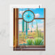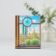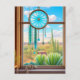 Postcard with pretty suncatcher in the window with a desert scene in the background. Cacti, white fluffy clouds.