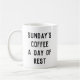 Start your Sunday with a moment of peace and a sip from this witty coffee mug! Perfect for coffee lovers who cherish their day of rest. Features the motivational quote "Sunday's Coffee, A Day of Rest" in sleek black typography on a clean background. Made with high-quality ceramic that keeps your coffee at the perfect temperature. Available in 11oz and 15oz sizes to enjoy your weekend relaxation. Makes a perfect gift for coworkers, friends, or any coffee enthusiast who appreciates weekend humour. Dishwasher and microwave safe.
