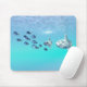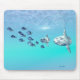 Two large sunfish escort a school of Blue Tango fish in the clear sunlit ocean.
