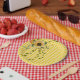sunflower and ivy bouquet with lady bug on yellow and white quilted background