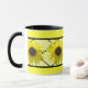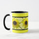 Sunny sunflowers against a black crisscrossed background and black trimmings. A lively coffee mug to help you start your day. For a special gift, include this mug with matching stationery, envelope, and stamp also available for a truly complete stationery gift set.