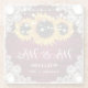 Personalized burgundy rustic wood and sunflower wedding glass coasters featuring sunflowers on a barn wood background adorned with white floral lace and string lights. Matching items available to complement these burgundy rustic floral wedding glass coasters.
