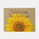 A sunny Welcome with a sunflower set on a rustic burlap print background with a custom template area for your name for a cute country style doormat.