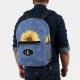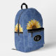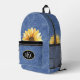 Show your beautiful personality with this blue denim-look backpack featuring yellow sunflowers and your monogram initials. This bag is roomy enough for everything you need to take with you, and can be used for computer, books, food, overnight travel, toys, dog supplies, beauty accessories - the list never ends. Great gift idea.