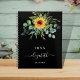 A black background. Decorated with sunflowers, eucalyptus greenery. Add a name, text. The name is written with a modern hand lettered style script with swashes.