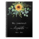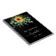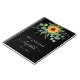 A black background. Decorated with sunflowers, eucalyptus greenery. Add a name, text. The name is written with a modern hand lettered style script with swashes.