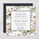 Fall watercolor sunflowers and pink florals on white background with wedding templates in a square box bordered in midnight blue. Midnight blue on back.