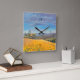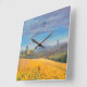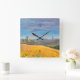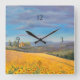 This modern wall clock features a print of an original oil painting entitled "Follow the Sun" by artist Leah Wiedemer. The image is of a bright yellow field of sunflowers, with a Tuscan farmhouse in the midground. Rolling hills are subtle shades of blue and violet and green, leading to distant mountains.