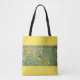 A vision of a field filled with sunflowers on a beautiful sunny day with a background of bright yellow. A cheery tote bag to carry around your essentials during the busy day.
