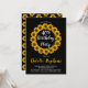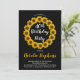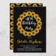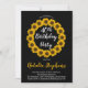 Sunny sunflowers wreath and pattern golden yellow, black and white birthday party invitations. Shown here for a 40th birthday, the invitation can be personalised for any age. Original design by Holiday Hearts Designs (all rights reserved).