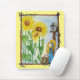 Original watercolor painting by Sandra Gale, featuring a group of sunflowers and a gardener's bag, hat and shovel. Great design for gardeners of all types and a perfect image of summer!