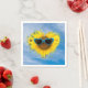 Yellow sunflower with heart sunglasses in a heart-shaped abstract frame on a summer sky background.