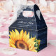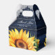 Put your bridal shower/wedding gifts into these elegant and romantic navy blue and sunflower rustic wedding favour boxes featuring sunflowers, string lights and white on a rustic wood background.