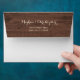 This rustic country design features golden white string lights, yellow sunflowers, navy blue roses, and white baby's' breath on the inside of the envelope against a dark brown barn wood background. A customisable name and return address appear on the back in golden white in popular script and serif typography on the same dark brown wood background. You can personalise this invitation for your own wedding by changing the text in the template.