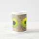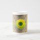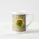 On this enchanting bone china mug are neon shades of green and yellow sunflowers on a rustic wood planks backdrop creating a country charm to spice up any kitchen decor.