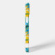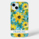 Customize this colorful modern sunflowers on teal painting iPhone 15 plus case with your your name in a trendy modern CAP font in teal on white. It's so beautiful and happy!