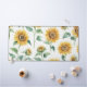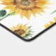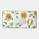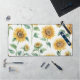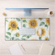 This desk mat features a cheery sunflower pattern in yellow and green against a white background.