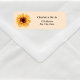 A a soft peach, orange background. Decorated with a sunflower head. Personalise and add your name and address. Black letters.
