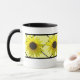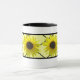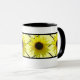 A cheerful mug with sunflowers heads on a black and yellow crisscross background. The ringer mug is accented in black, but can be "Customised" to another colour.