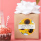 Sunflower return address labels in round shape. Yellow sunflower bouquet over blue sky image is the background for name and address in fun, black printed text.