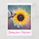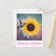 A Vibrant hummingbird hovers near a bright yellow sunflower. Its long beak reaching for nectar. The sunflower's dark centre and green stemmed a natural touch, while the hummingbird's iridescent feathers shimmer in shades of green and blue. The simple bad lines and bright colours create a charming and uplifting scene, perfect for nature lovers and flower enthusiasts.