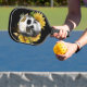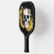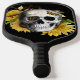 On the front of this pickleball paddle is an image of a gleaming white skull with a bouquet of yellow sunflowers behind it. A butterfly flits around the top of the skull. Unique! The back is solid black, with your triple monogram in white at the bottom.