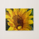 Colourful and bright, this SUNFLOWER SUN features a beautiful photograph of a rich yellow sunflower in full bloom, its petals tinged with orange near the base as a bee works busily at its golden centre with lush green foliage and hints of another sunflower in the background.