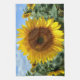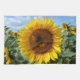 Close up of a sunflower taken against a backdrop of a field of sunflowers