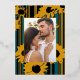 Announce your celebration with this bold modern teal blue and gold foil sunflower wedding invitation. This striking design features artistic sunflower silhouettes with luxe gold foil accents highlighting your names and wedding details, paired with integrated teal accents, striped patterns, and clean modern typography. The back showcases your favorite engagement or pre-wedding photo for a personal touch.