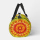 This vibrant Gear bag features a bold Tie Dye pattern reminiscent of sunflowers, with radiating designs in sunny yellow, fiery red, and touches of green. It's a cheerful Kit bag and a stylish Weekender for your journeys.