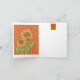 This design is a cheery summer trio of sunflowers on a red background with flourishes and stripes. Inside on the left is a repeat of the design as a lighter image, on the right top side there is a postage size image in the same bold colours as on the front side with lots of room to write your message.