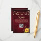 Elegant, gold string lights on rustic wood burgundy wedding details card with QR code for more information and sunflower.