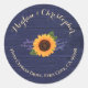 This rustic country design features a single sunflower with lavender sprigs against a navy blue barn wood background. The customisable name and return address appear in warm white in popular script and serif typography. You can personalise this invitation for your own wedding by changing the text in the template.