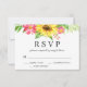 Sunflower Wedding RSVP Card with number attending option. The card is decorated with a beautiful cascading sunflower bouquet at the top of the card. The back of the card is decorated with soft yellow watercolor stripes.