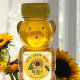 A square yellow label with vintage sunflower illustration and realistic bee. The word "Honey" is written in a decorative brown font. The 1.5” x 1.5” looks nice on 8 & 12 oz honey bear.