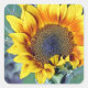 Beautiful photograph of a yellow and orange streak sunflower, with its head angled up towards the sun with a few drops of water on the petals