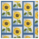 Bright yellow Sunflowers are framed in blue. A happy and colourful fabric for decorating your home and making fun accessories. Original painting and design by Jan Law, international artist