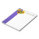 5.5” x 6” white notepad with an image of three bright yellow sunflowers and blue seas statice and a wide purple border. Optional text.