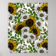 Hand-drawn vector pattern with bouquets of sunnflowers, daisy, camomille and eucalyptus