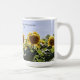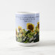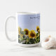 Original photograph consisting of a row of blooming sunflowers against the summer sky. Bible Scripture from Psalm 103:22 is on the front of the cup - a nice worship Scripture to start the day!