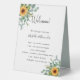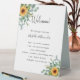 A modern, elegant, wedding program, timeline. A chic white background. Decorated with sunflowers, green watercolored eucalyptus greenery. Personalise and add your names and wedding details. Black coloured letters. If you have more text it's possible to reduce the line space.