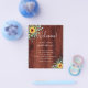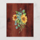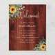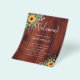 A modern, elegant, wedding program, timeline. Rustic brown wood as background. Decorated with sunflowers, green watercolored eucalyptus greenery. Personalise and add your names and wedding details. If you have more text it's possible to reduce the line space, and remove the decor on the back.